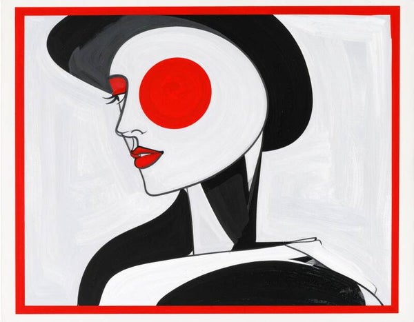 Canvas: “The Silent Ego”Abstract portret in zwart/wit met een rode accentrand. Staat symbool voor de balans tussen zelfvertrouwen en kalmte.